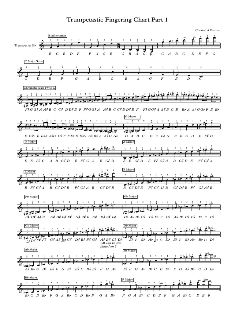 Trumpet Fingering Chart Pdf. Tomplay Interactive fingering charts tool allow you to view and learn fingering for flute, clarinet, trumpet, saxophone alto, saxophone tenor, saxophone soprano and much more. You can also download the fingerings in PDF format for free and print them.